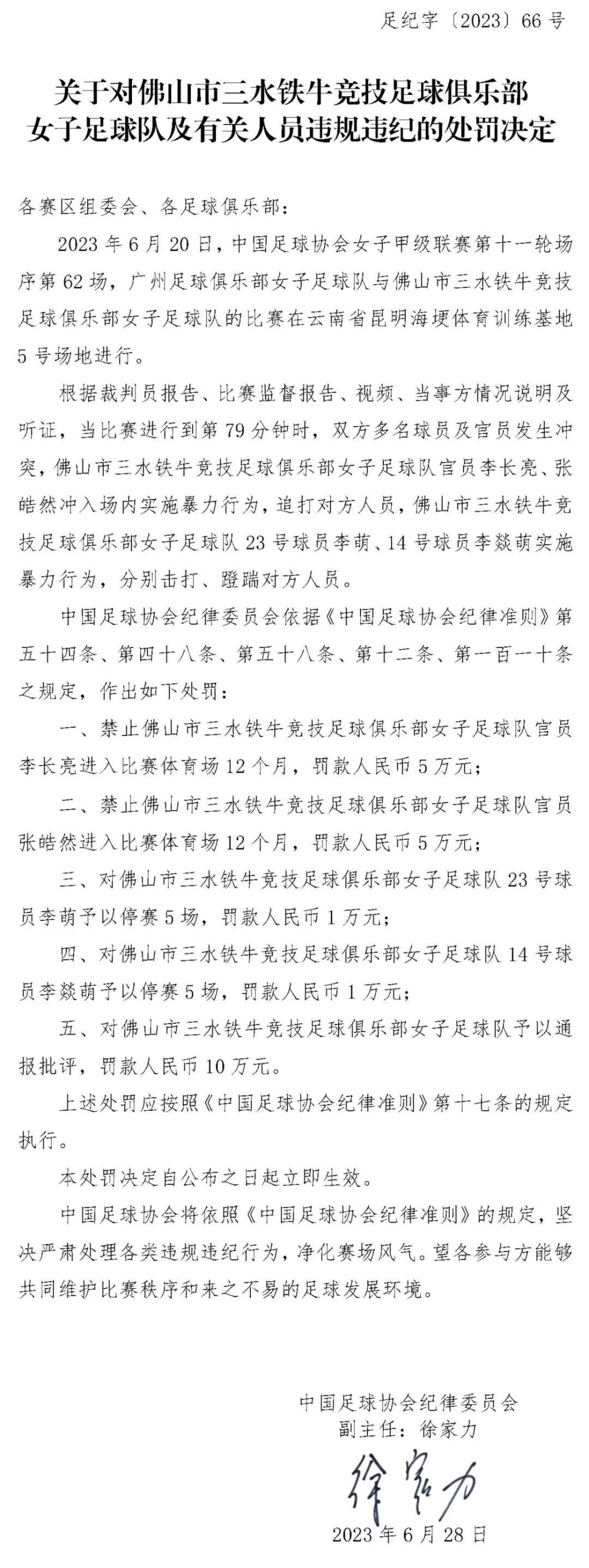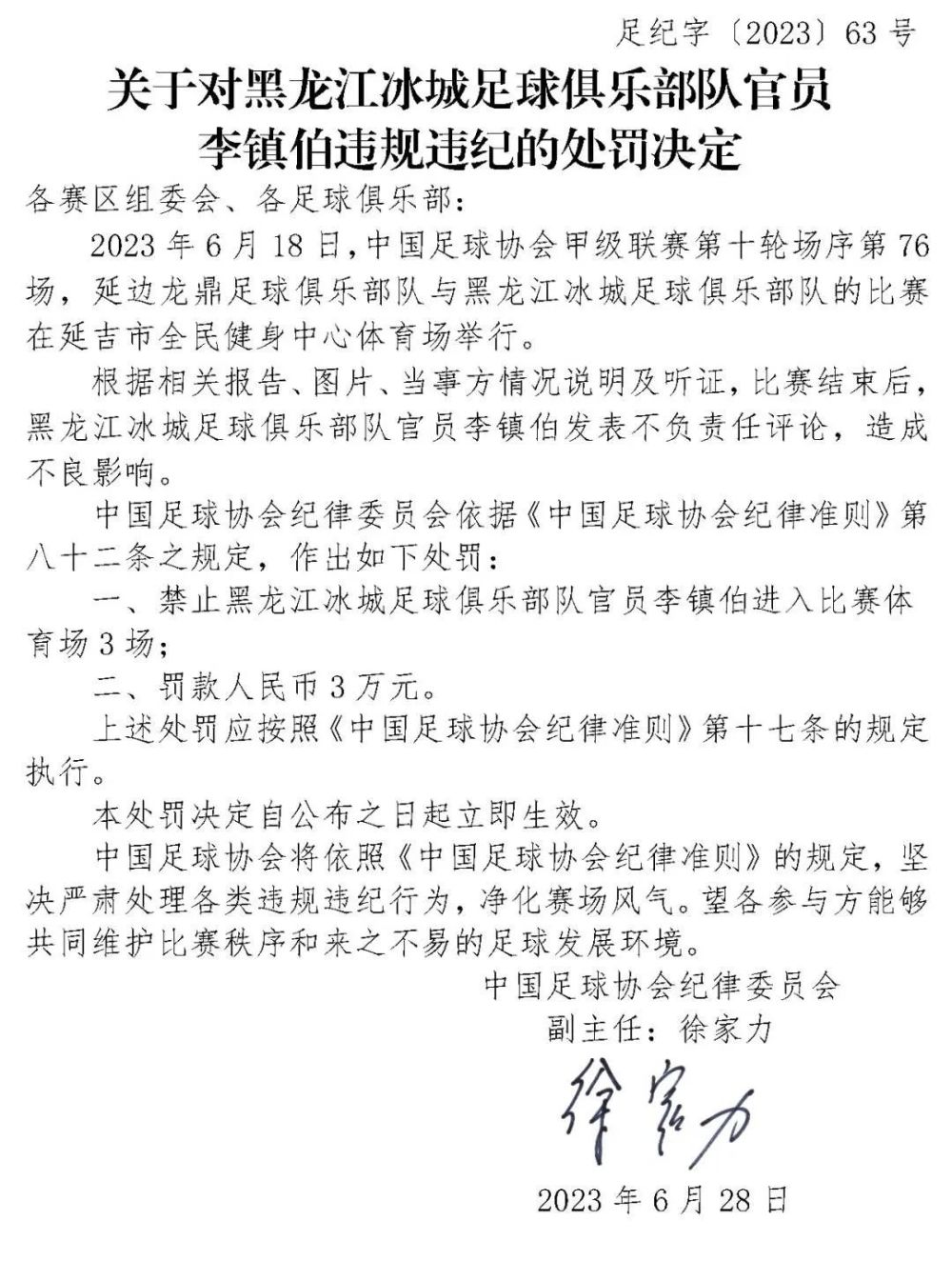 6月28日,中国足球协会官方网站发布五份处罚决定。具体内容如下。